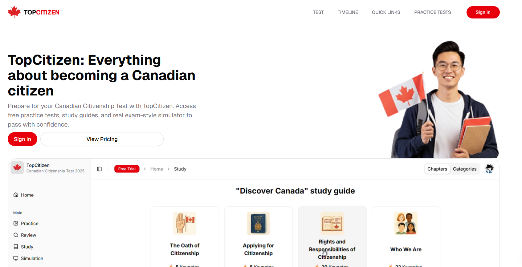 Prepare for your Canadian Citizenship Test with TopCitizen. Access free practice tests, study guides, and real exam-style simulator to pass with confidence.